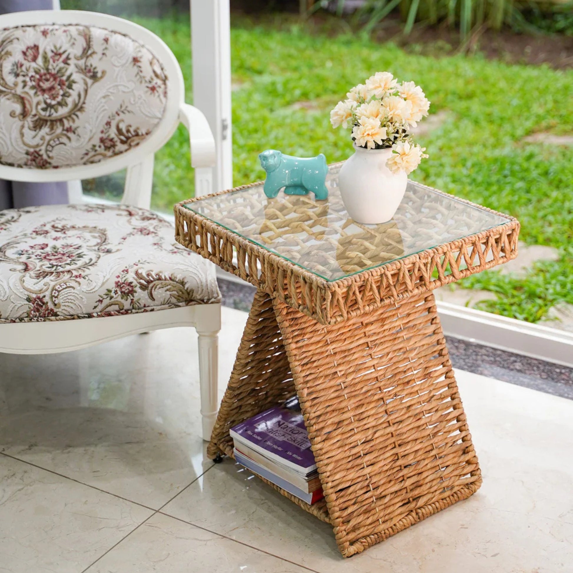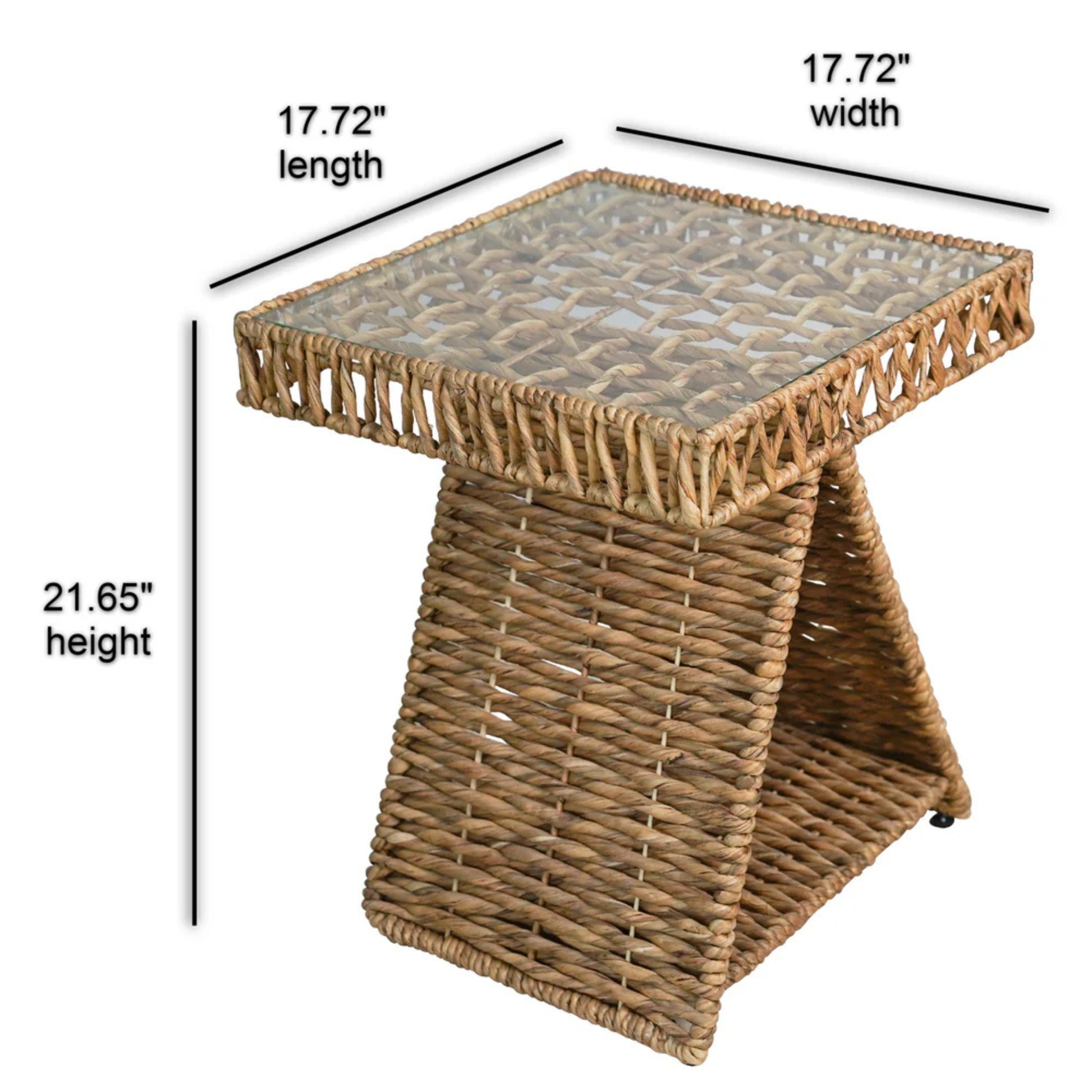 Geometric Woven Water Hyacinth End Table with Tempered Glass Top and Shelf